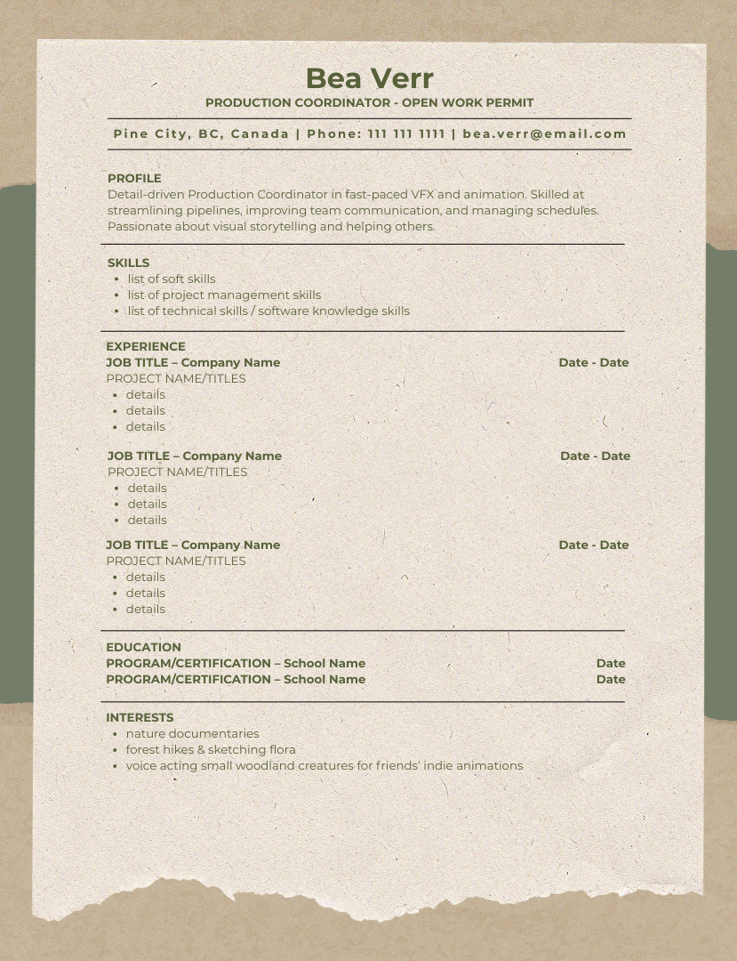 Don’t be discouraged if your background is NOT in film/TV/VFX/animation. In the many years I’ve been in the industry, I’ve worked with Production peeps whose work experiences drastically varied between retail, poli-sci, engineering, food —even cheerleading! What’s important to showcase is HOW you are a fit based on the skills and responsibilities the job is looking for.